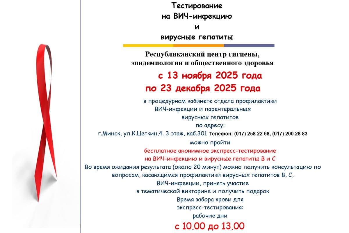 В 13 ноября по 23 декабря 2025 года в процедурном кабинете отдела профилактики ВИЧ-инфекции и парентеральных вирусных гепатитов можно пройти бесплатное анонимное экспресс-тестирование на ВИЧ-инфекцию и вирусные гепатиты В и С.