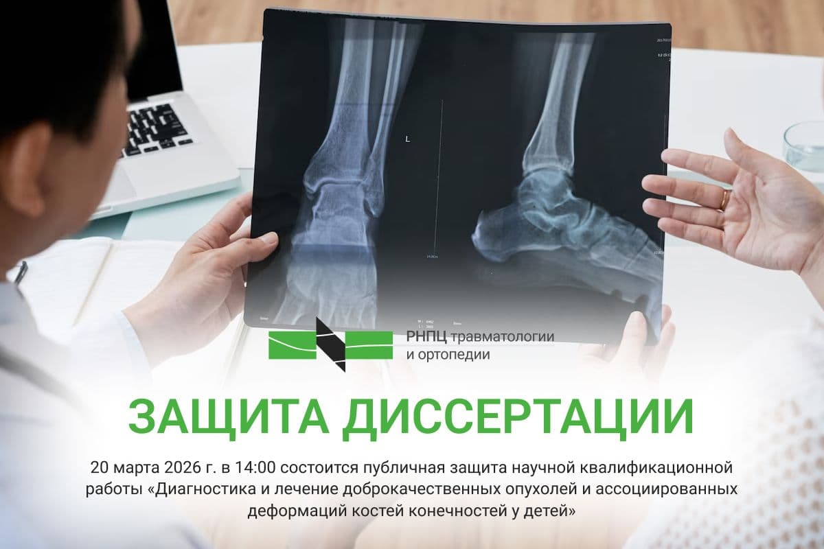 В конференц-зале РНПЦ травматологии и ортопедии 20 марта 2026 г. в 14:00 на заседании совета по защите диссертаций Д 03.04.01 состоится публичная защита научной квалификационной работы «Диагностика и лечение доброкачественных опухолей и ассоциированных деформаций костей конечностей у детей», представленной на соискание ученой степени доктора медицинских наук по специальности 14.01.15 – травматология и ортопедия, врачом-травматологом-ортопедом травматолого-ортопедического отделения для детей РНПЦ травматологии и ортопедии Шпилевским Игорем Эдуардовичем.