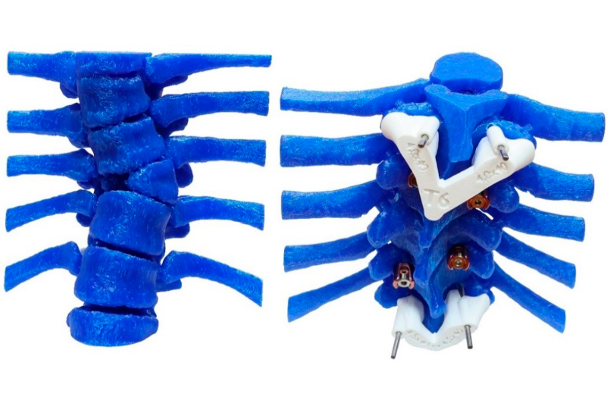 После компьютерной томографии врач получает точную модель деформированного позвоночника, распечатанную на 3D принтере, кроме этого, печатаем индивидуальные навигационные шаблоны, благодаря которым транспедикулярные винты для стабилизации позвоночника вводим точно и безопасно.